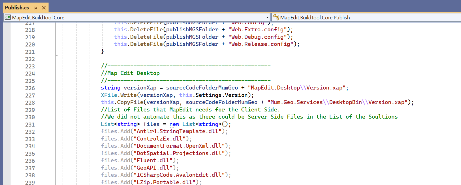 Wenn neu DLLs in MapEdit oder in eine der Fachschalen hinzugefügt werden, dann müssen diese DLLs in die Build Maschinerie "MapEdit.AutoBuild" eingebunden werden.