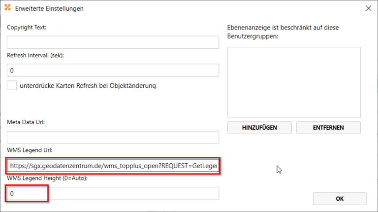 Das Feld WMS Legend Height ist optional. Wenn man es auf 0 setzt kommt das Bild in Originalgrösse. Es kann sein das das Bild zu gross oder zu klein vom Server kommt und dann nicht gut dargestellt wird.