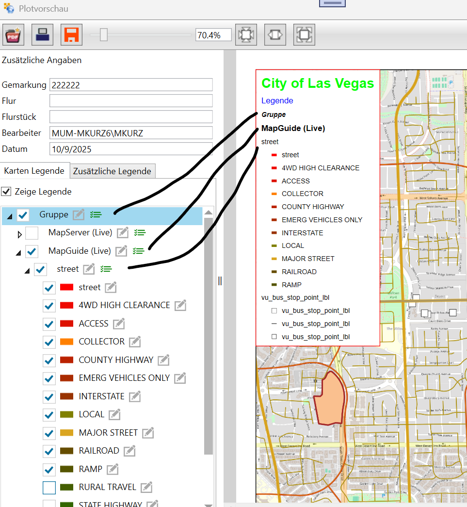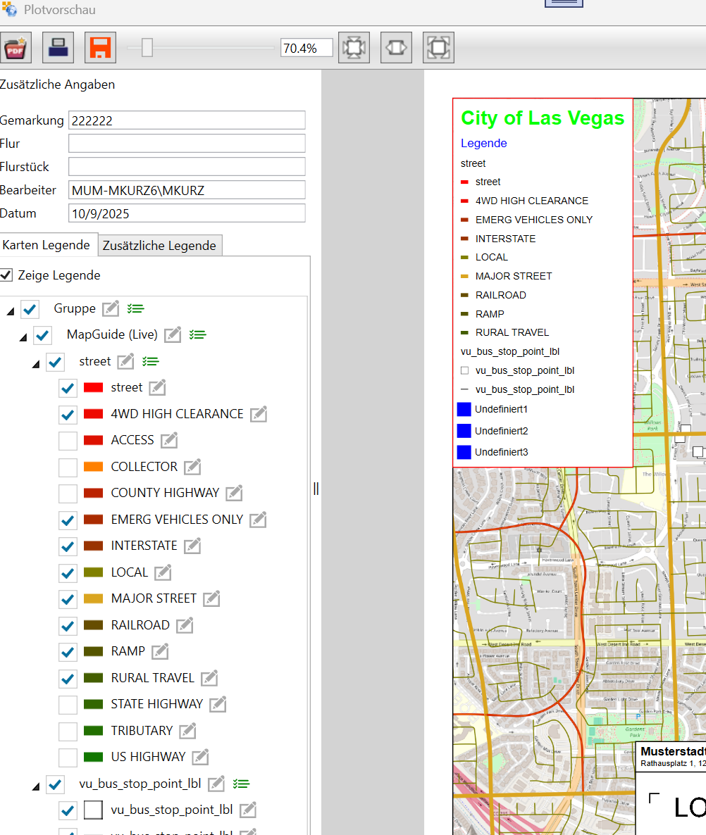 Eine Legende kann in den Ploteinstellungen konfiguriert werden. Hier der Standardeintrag, damit werden alle Layer der MapGuide Karte angezeigt.