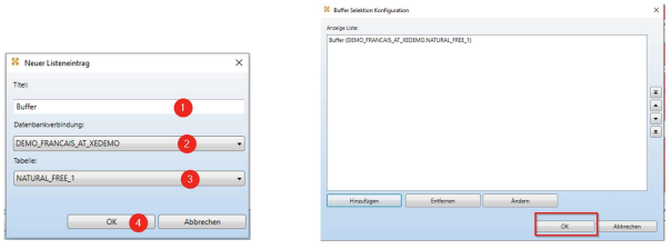 Über Hinzufügen werden alle Datenbankverbindungen mit den dazugehörigen Geometrieobjektklassen angeboten. Der Admin vergibt einen Titel, wählt die Datenbankverbindung und die Tabelle. Durch Betätigen der Schaltfläche OK wird die Buffer-Selektion fertig konfiguriert.