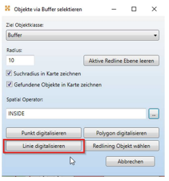 Die Anwender haben nun die konfigurierte Buffer-Selektion über den Befehl Objekte mittels Buffer selektieren zur Auswahl. Nach Auswahl der Ziel Objektklasse und Einstellung des Radius kann der Spatial Operator ausgewählt werden. Hier im Beispiel sollen alle Bäume entlang einer Linie gewählt werden, die innerhalb des Buffers mit Radius 10 m enthalten sind.