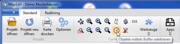 Der Aufruf der Funktion Objekte mittels Buffer selektieren erfolgt über den folgenden Punkt in dem Ribbon "Funktionen" in MapEdit Desktop.