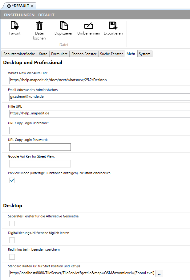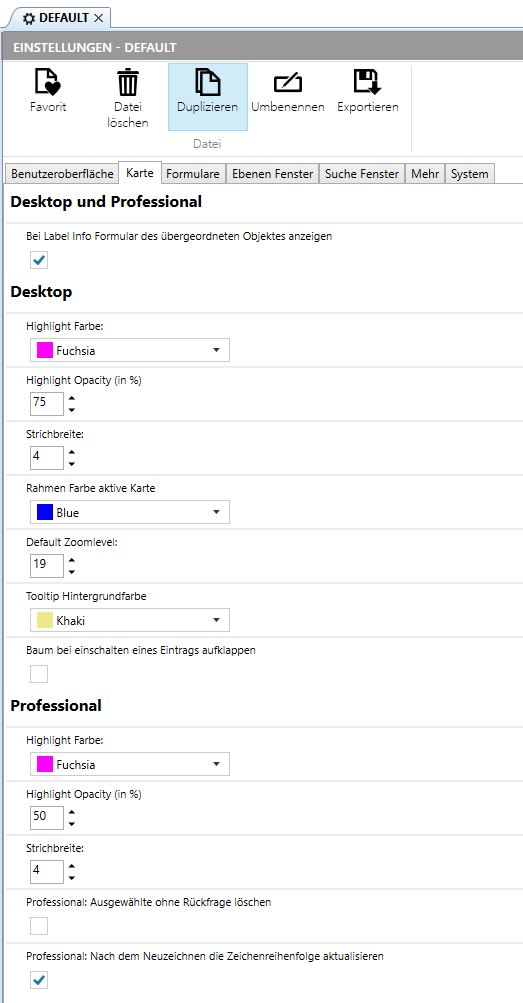 Hier erfolgen Einstellungen die die Karten in MapEdit Desktop und MapEdit Professional betreffen: