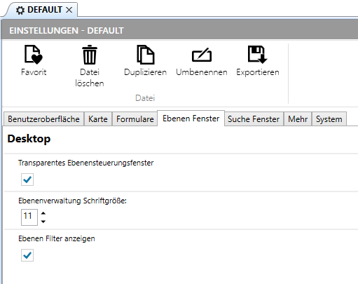 Es besteht die Möglichkeit, die Ebenensteuerung als nicht transparent anzuzeigen und die Schriftgröße der Ebenen (Karten) zu ändern. Ebenfalls kann hier der Filter der Ebenensteuerung auch wieder ausgeschaltet werden:
