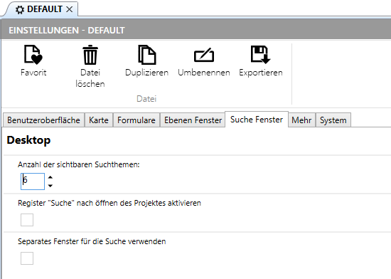 Wenn Sie mehrere Suchen definiert haben, dann können Sie hiermit festlegen, wieviele dieser Suche direkt angezeigt werden (die weiteren werden durch aufklappen dann erst sichtbar). Im Standard öffnet sich ein MapEdit Projekt mit dem Focus auf der Ebenensteuerung - der Anwender sieht sofort die eingerichteten Karten. Alternativ kann man hier die Suche zuerst anzeigen. Und es besteht die Möglichkeit, diese Suchen in einem extra Fenster anzeigen zu lassen. Diese kann auch auf einen anderen Bildschirm verschoben werden.