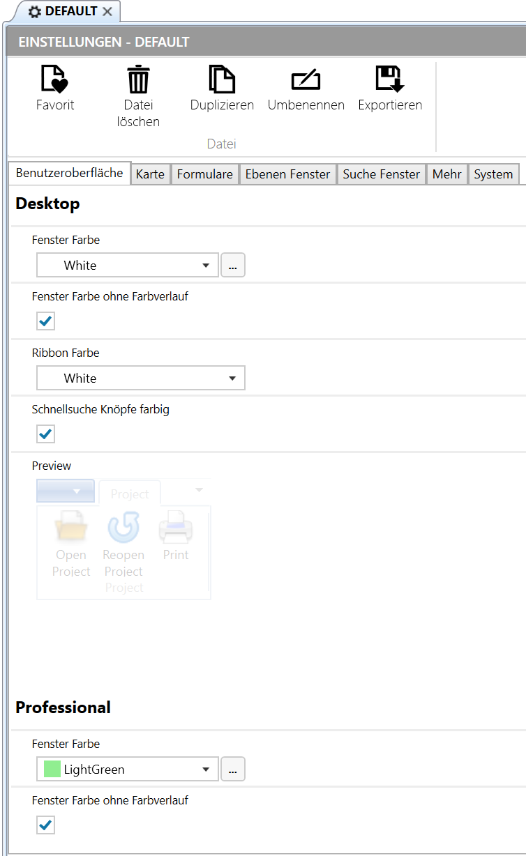 Über die Einstellungen der Benutzeroberfläche kann die Farbe der Fenster für MapEdit Desktop und MapEdit Professional nach eigenen Wünschen verändert werden: